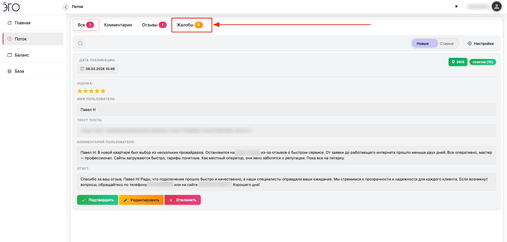 Ответить на отзыв также можно в личном кабинете ЭГО. В меню Поток откройте вкладку Отзывы, где под каждым неотвеченным отзывом вы увидите оптимальные ответы, заранее сформулированные сервисом. Вы можете отредактировать их вручную или отправить как есть, нажав Подтвердить.