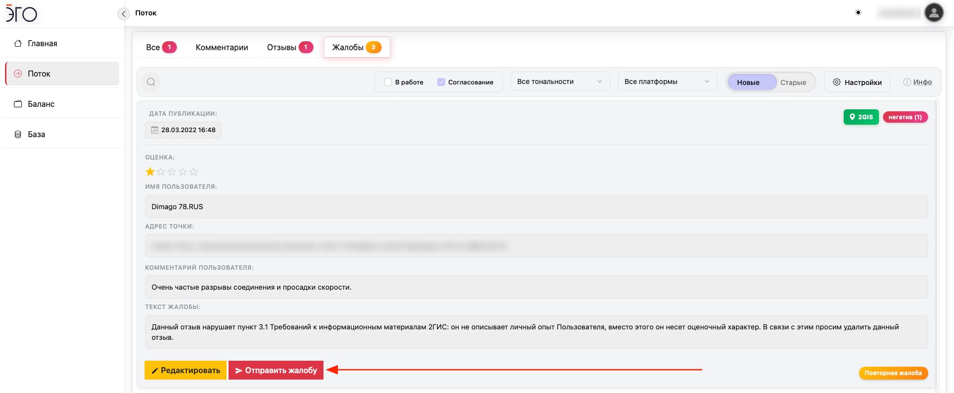 Мы рекомендуем работать с негативными отзывами на 2ГИС и Яндекс Картах с помощью сервиса ЭГО, так как он подгружает негатив со всех карточек всех филиалов в одно окно, автоматически формирует жалобы и дает статистику удалений.