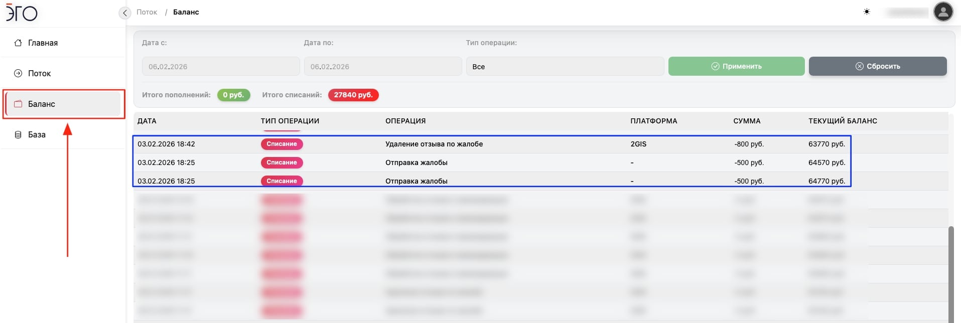 - В меню База вы можете просмотреть статусы обжалованных отзывов, а в меню Баланс — историю списаний за обжалования и удаления. Оплата последних списывается только по факту операции.