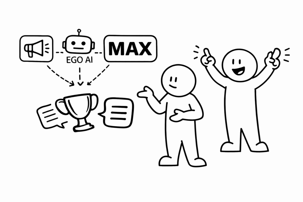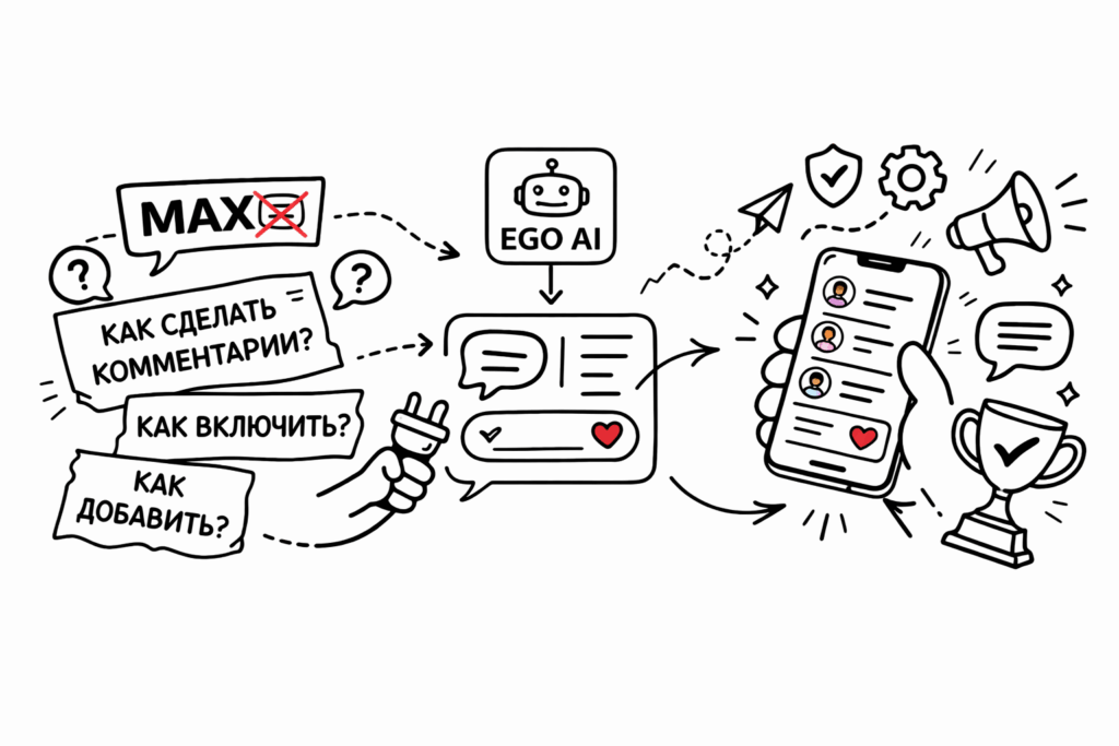 И всё это — через мини-приложение. И да, мы первые, кто сделал конкурс с ботом в Макс. Наше решение – не просто возможность оставлять комментарии под постами, это интерактив с участием бота и всеми преимуществами системы Эго. Подробнее про систему